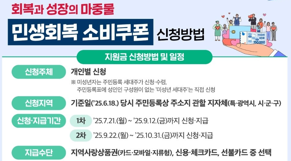 민생회복을 위한 2차 소비쿠폰은 어려운 경제 여건 속에서 국민의 부담을 덜어주고 지역경제를 활성화하기 위한 중요한 정책입니다. 자격 요건을 충족하면 혜택 신청을 반드시 하고, 불이익을 받지 않도록 사용 시 주의사항을 꼼꼼히 확인해야 합니다.