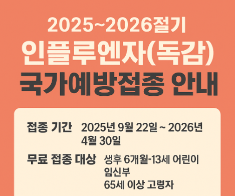 이 예방 접종은 2025년 9월 22일부터 2026년 4월 30일까지 진행됩니다. 단, 연령과 상황에 따라 세부 일정이 구분되어 있으므로 확인이 필요합니다.