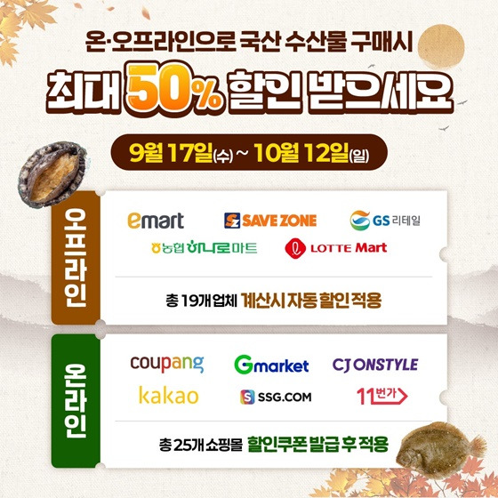 - 국내산 해산물은 전국 대형 할인점과 유통점에서 할인된 가격으로 구매할 수 있습니다.