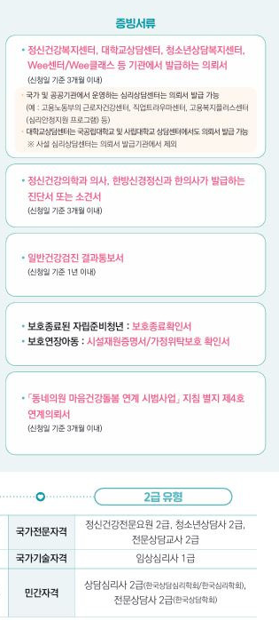 정신과 의사나 한방 신경정신과 의사가 발급한 진단서나 소견서(3개월 이내)가 있어야 하며, 치료 중 또는 치료 후에 신청할 수 있습니다. - 국가 건강 검진 중 우울증 선별 검사(PHQ-9)에서 중등도 이상의 우울증(10점 ↑)으로 확인된 사람