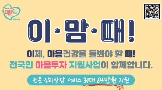이에 정부는 모든 국민이 심리적 지원을 받을 수 있도록 전국적인 정신투자 지원 사업을 시작했습니다. 단순한 치료 수준이 아니라 마치 투자처럼 마음을 자산으로 관리할 수 있도록 지원하는 종합 정책입니다.