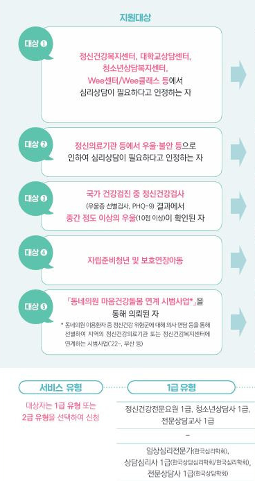 - 지원 사업은 1년에 한 번만 신청할 수 있으며, 이미 다른 심리 지원 사업을 받고 있는 경우 '중복 혜택 없음' 원칙이 적용됩니다.