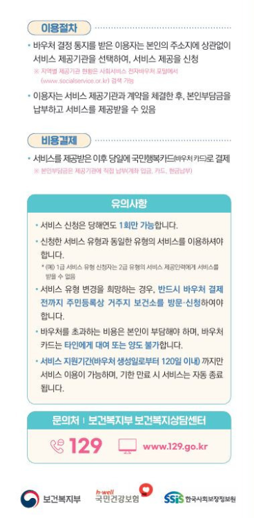 바우처 결제는 국민행복카드, 복지카드 등의 바우처를 사용하며, 서비스 소진(상담 완료) 후 즉시 정산되므로 현금이 필요하지 않으며, 행정복지센터 및 서비스 기관으로부터 추가 정보를 받을 수 있습니다.