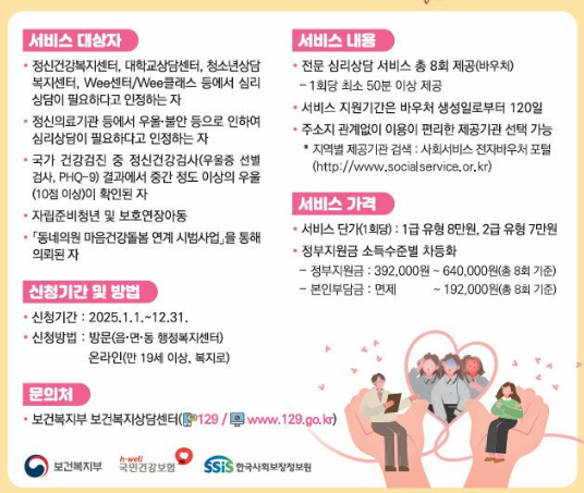 - 서비스 문의 및 신청은 복지로, 보건복지부 상담센터(129), 주민센터(읍면동 행정복지센터), 사회서비스 전자바우처 포털, 서비스 기관(psych 상담센터, 정신건강복지센터 등)에서 할 수 있습니다.
