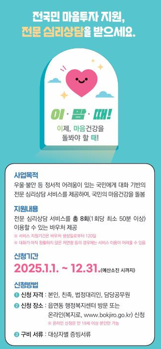 2025 전국민 마인드 투자 지원 사업은 우울증, 불안 등 정서적 또는 심리적 어려움을 겪는 모든 국민에게 전문 심리상담 서비스 바우처를 지원하는 국가 정책 사업입니다. 사업 운영 기간은 2025년 1월 1일부터 12월 31일까지이며, 연중 신청이 가능하지만 예산 소진이나 사업 운영 여건에 따라 조기 마감이 가능하기 때문에 조속히 신청하는 것이 핵심입니다.