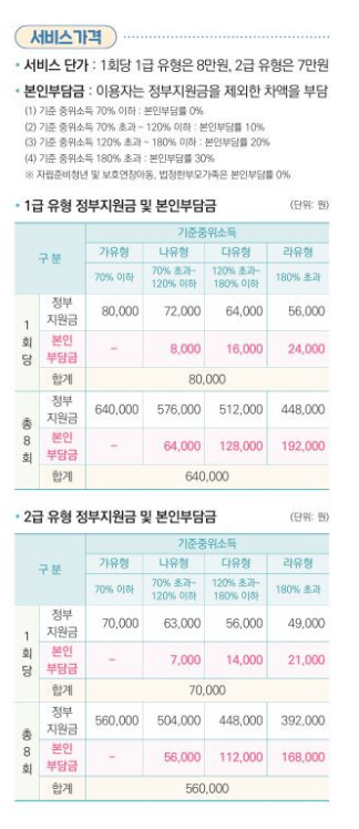 각 바우처 지원 및 상담 세션의 정부 보조금 및 본인 부담금은 기준 중위 소득에 따라 아래 표와 같이 차등 적용됩니다: